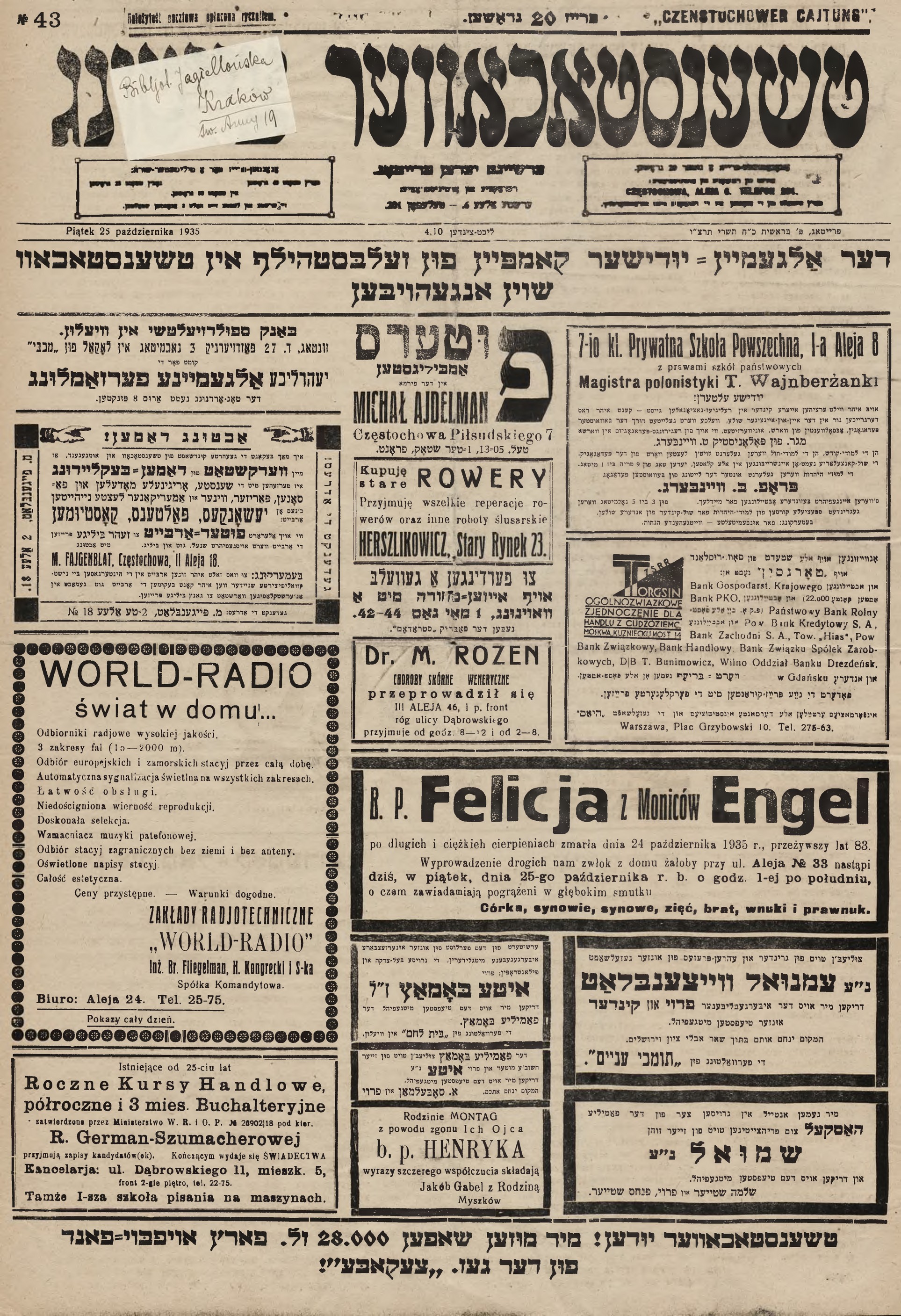| The plaque with the inscription on the tombstone was not found. Buried in a plot with graves from the years 1935 - 1936. No death certificate for his name was found in the population registry and archives. The attached condolence ads from October 1935 were found in the local weekly.Apparently Shmuel Haskell, son of Haim, who was born in Czestochowa on April 8, 1895, and on January 23, 1927, married Esther Lewkowitz. |